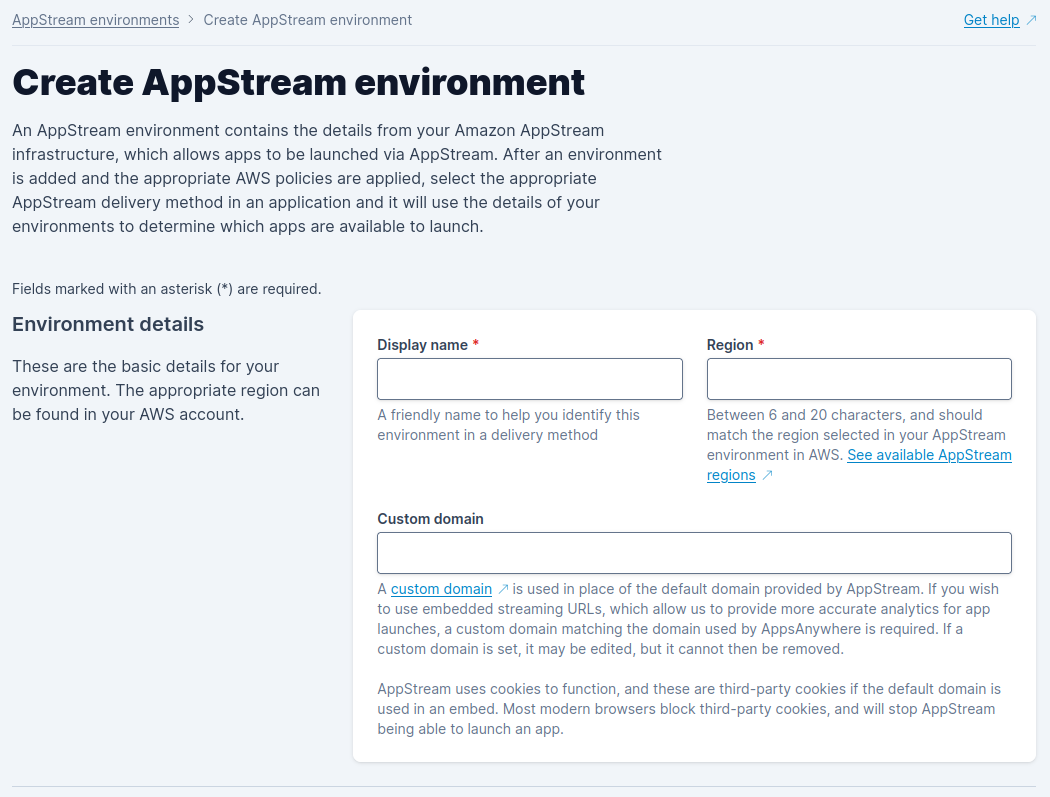 Enter the details of your AppStream environment