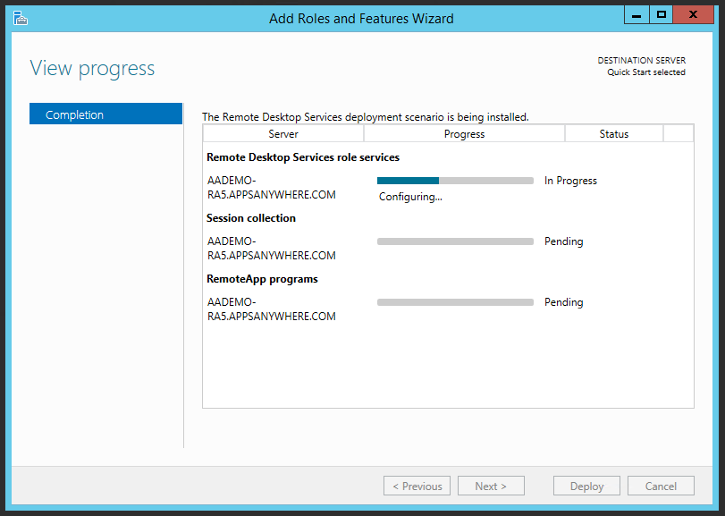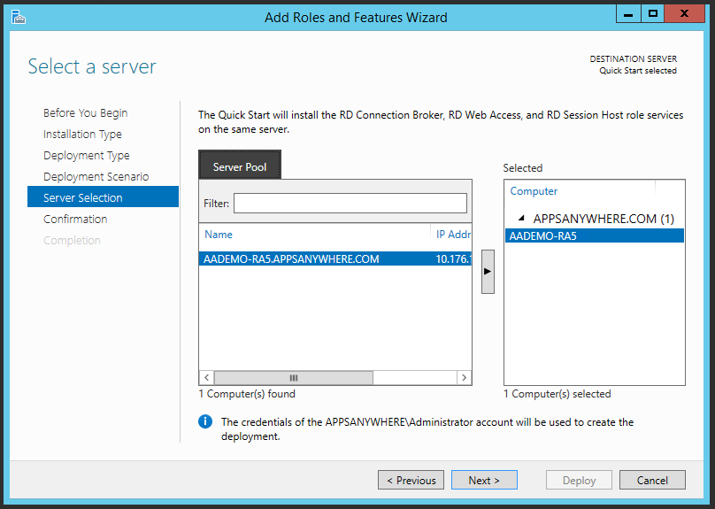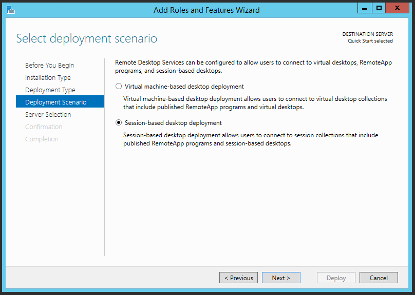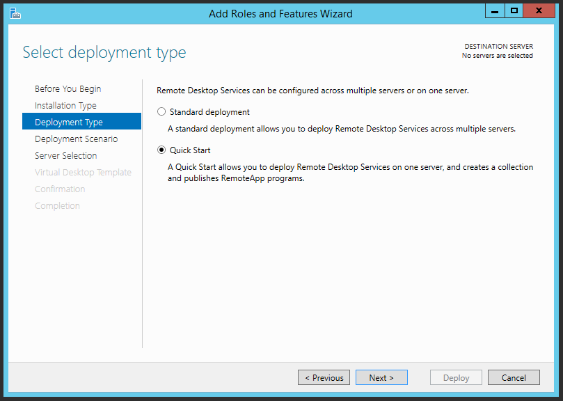 On this screen, you select whether you want to install a single-server deployment or set up a multi-server environment with all of the various components required for RemoteApp split across different machines. For the purpose of this example, we use the Quick Start option, with all components residing on the same box. Be sure to select the option that best suits your requirements.