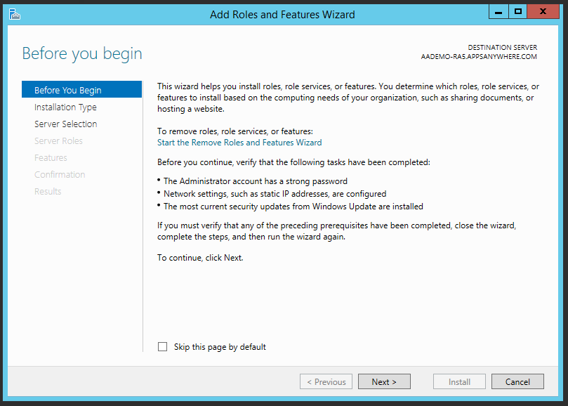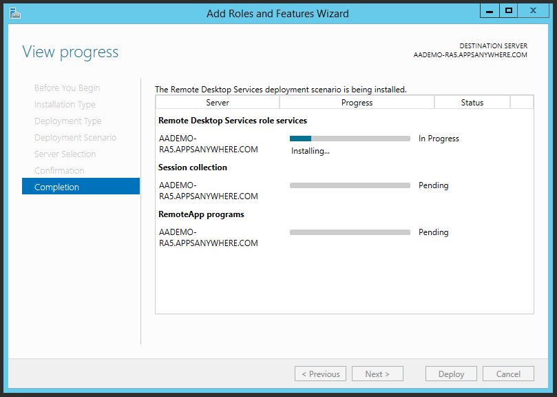 The following process is what the AppsAnywhere team use to configure a single-server demo environment for RemoteApp. These notes are meant to assist a complete novice get up and running with their first RemoteApp server but do not reflect any best practice for using RemoteApp in a production environment.