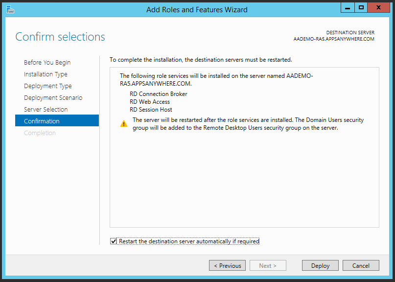 This final screen just confirms the details of the servers that will be affected and the roles that will be installed on each (or in our case, just the one). Ensure the details are correct and then continue.