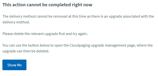 By clicking Show Me, you will be taken to the Cloudpaging Upgrade Management page with a filter applied to show you all of the defined upgrades that are linked to the delivery method you are trying to delete. See the Deleting a Cloudpaging Upgrade page for information on how to delete the relevant upgrades to get to the point where you can then delete the delivery method.