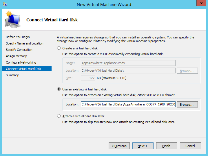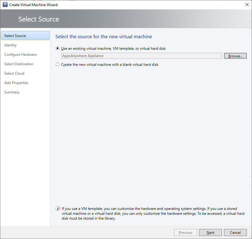 Select Use an existing virtual machine, VM template or virtual hard disk and browse to the AppsAnywhere VHDK file.