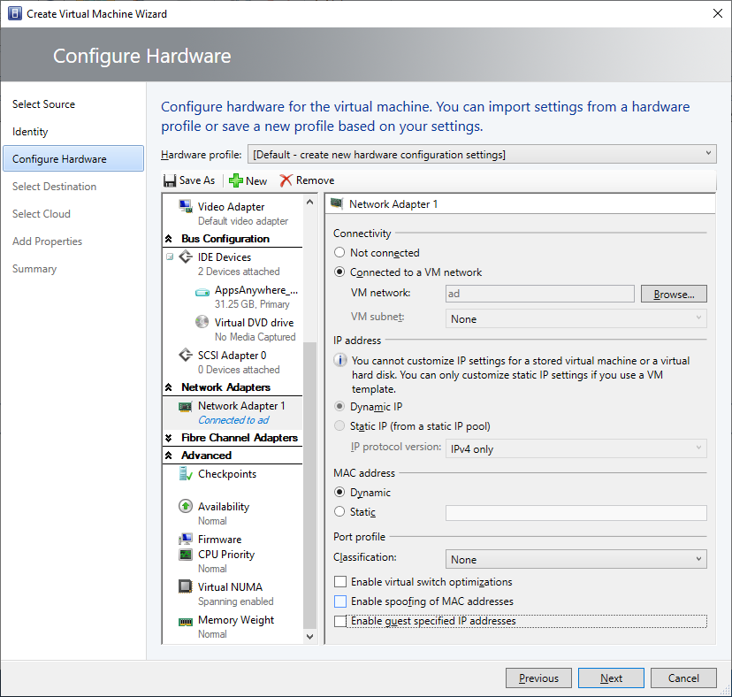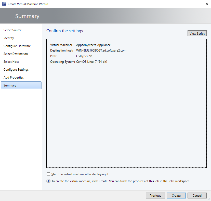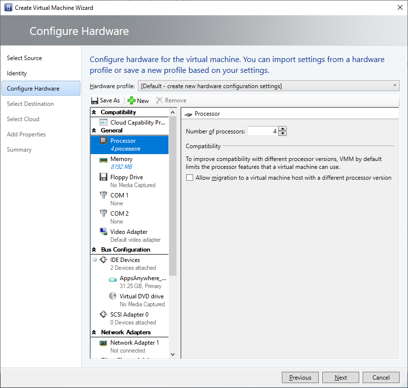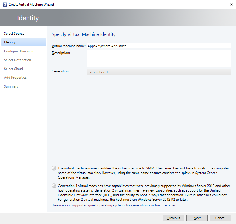 The Hyper-V AppsAnywhere appliance is provided as a single VMDK virtual disk image. To deploy the appliance, you will first need to create a virtual machine with the System Center Virtual Machine Manager.
