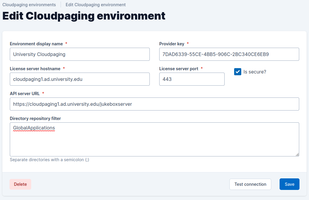 Remind yourself of what all the fields are and what values are expected by referring back to the Adding a Cloudpaging Environment page.