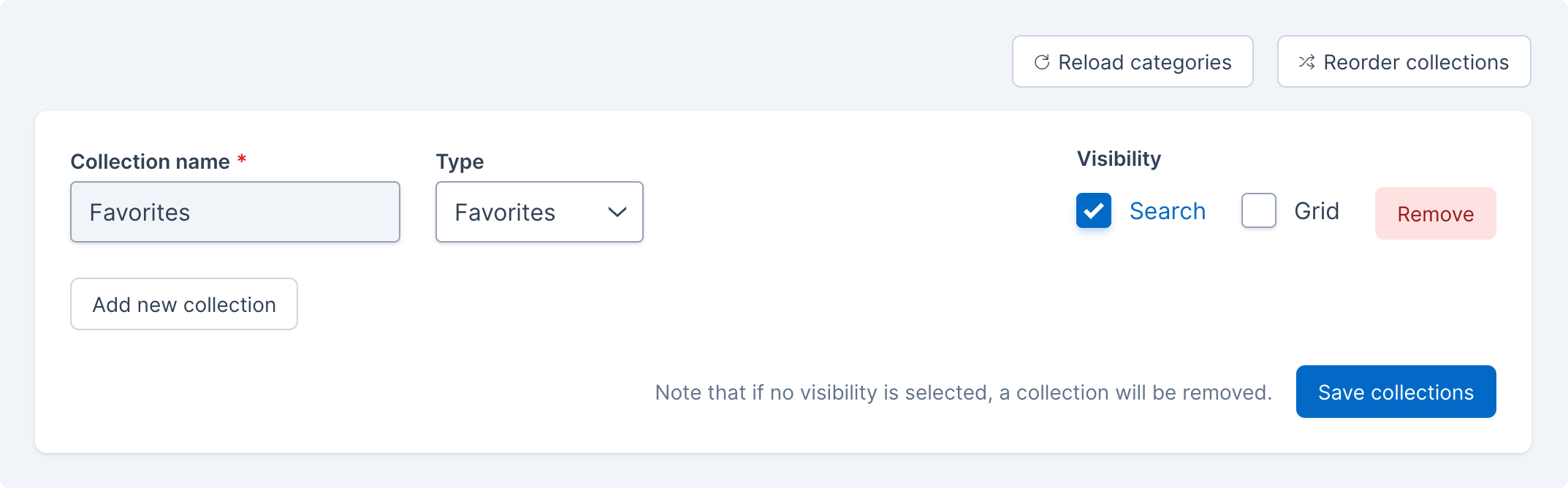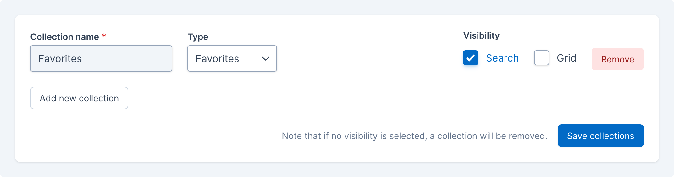 An example of the removal of the Favorites collection, with the Remove button highlighted
