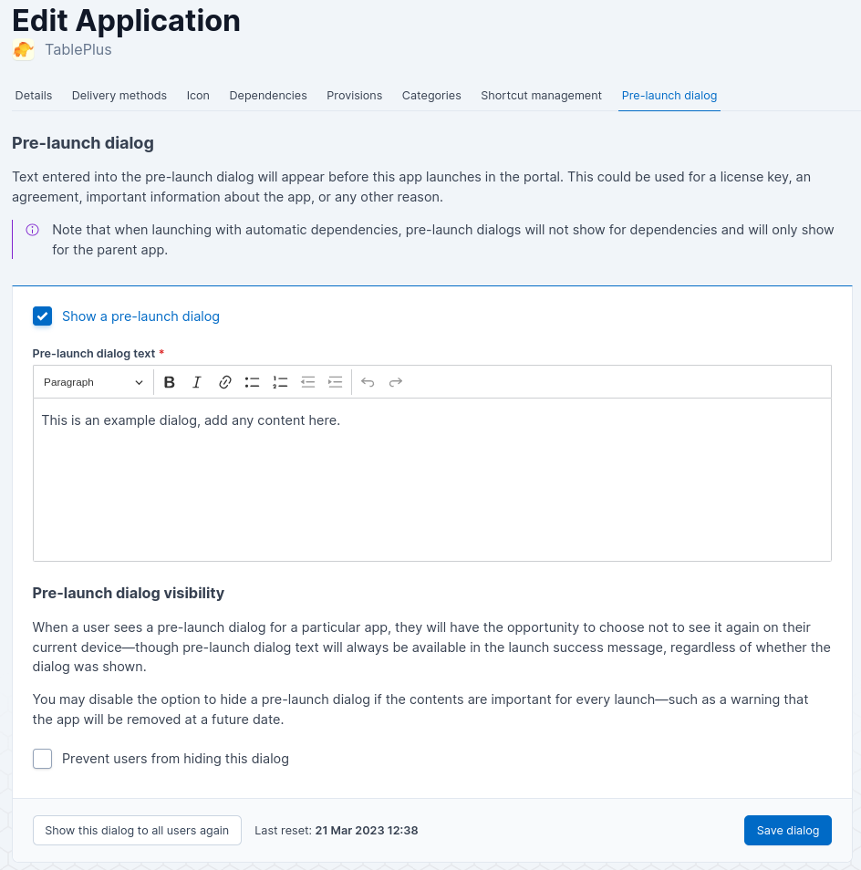 To update a dialog, simply navigate to the application edit screen and select the Pre-launch dialog tab.