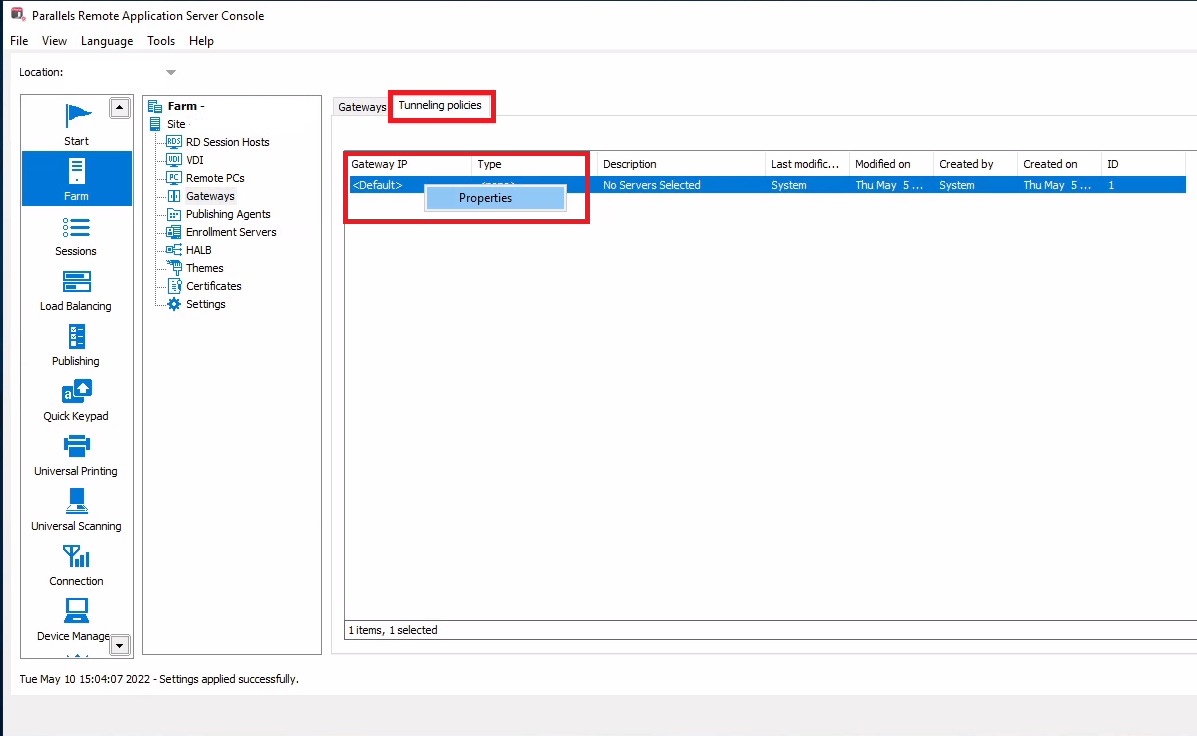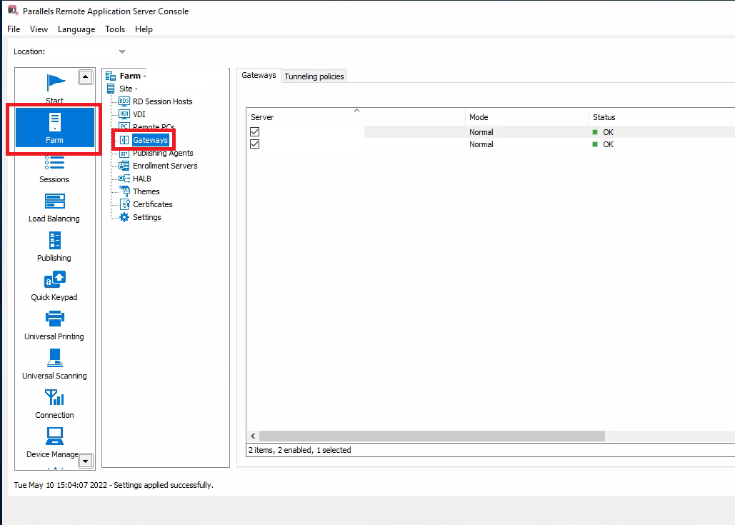 To disable tunneling polices for the Parallels RAS Secure Client Gateway, launch the Parallels RAS Console. Select the Farm tree entry and then the Gateways section.