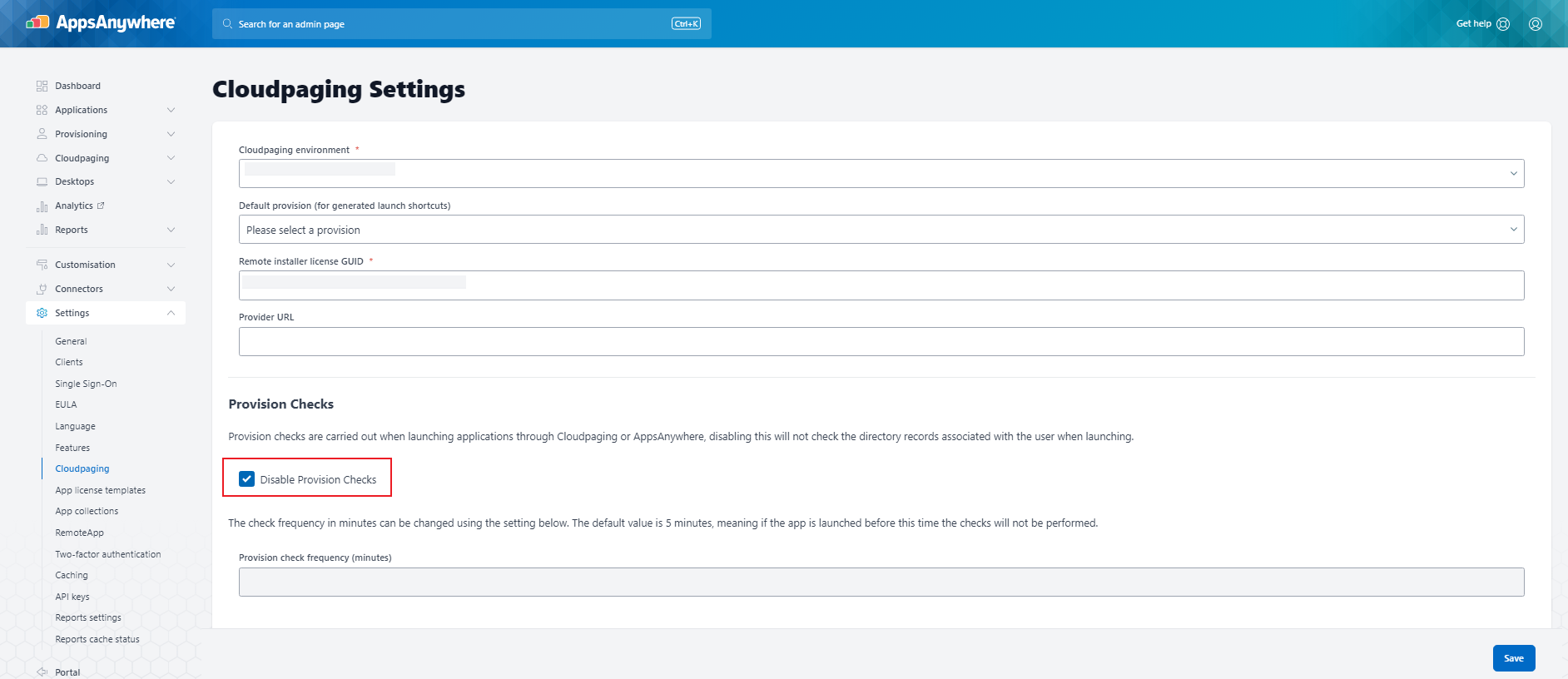 Disable Provision Checks should be checked in Cloudpaging Settings