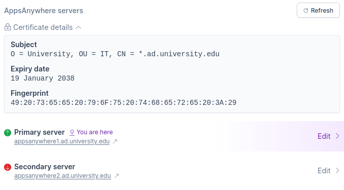 The status of each AppsAnywhere server in the pool is displayed here, with each server’s status affected by one of two things: