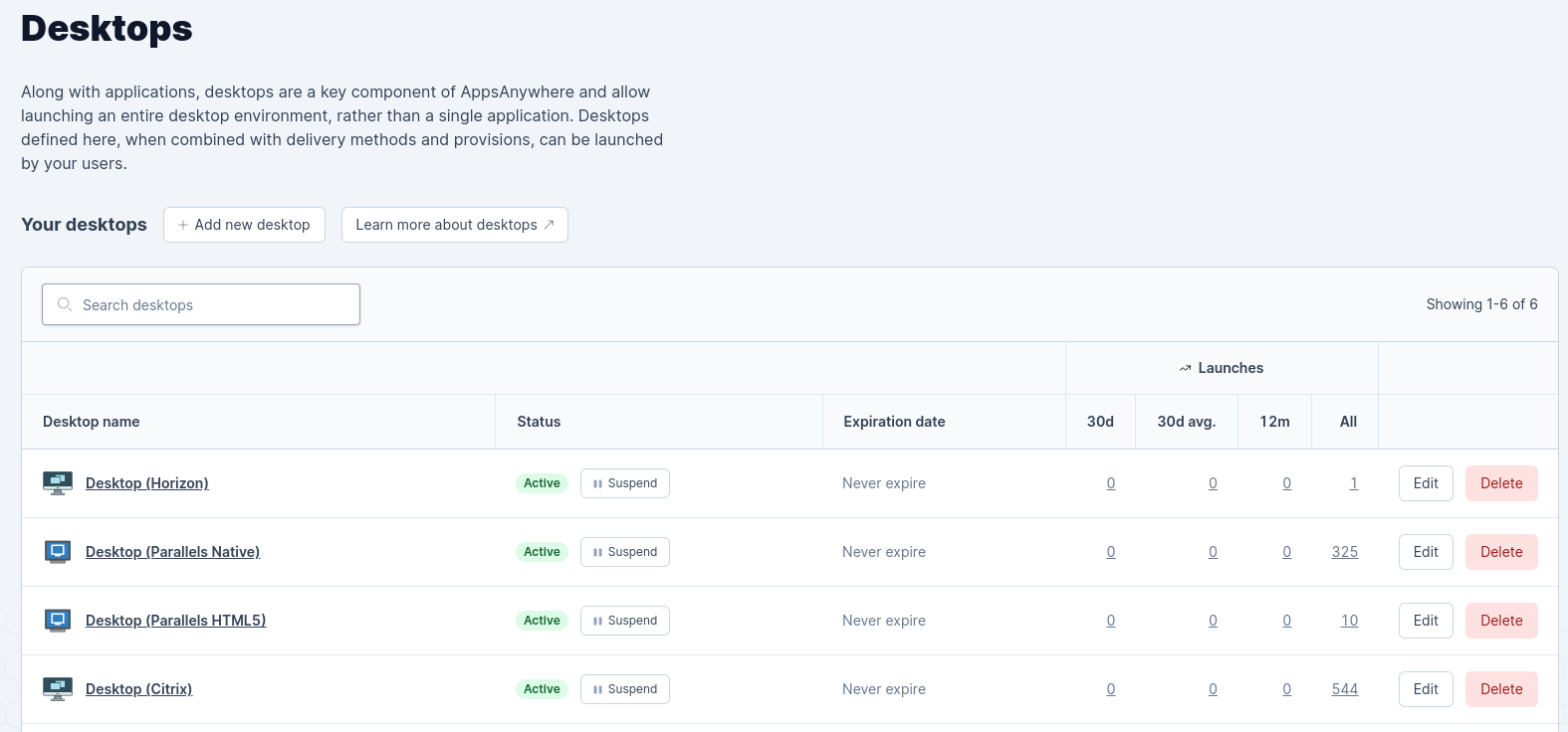 Here you will see a full list of desktops currently defined in AppsAnywhere.