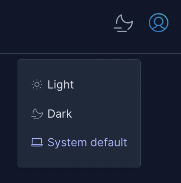 Each user can choose if the portal is displayed in dark or light mode by opening the theme menu, located at the top right of the portal.