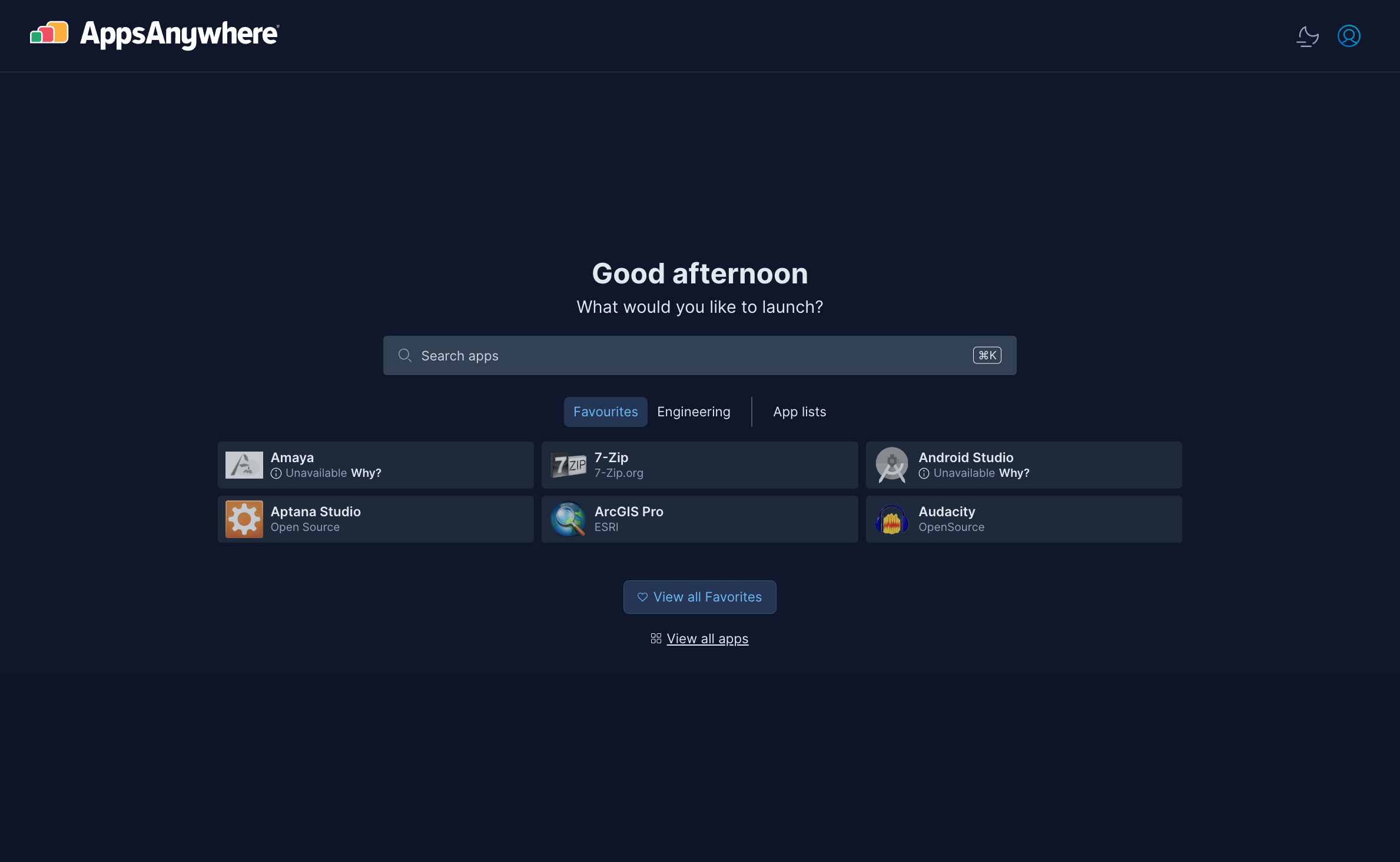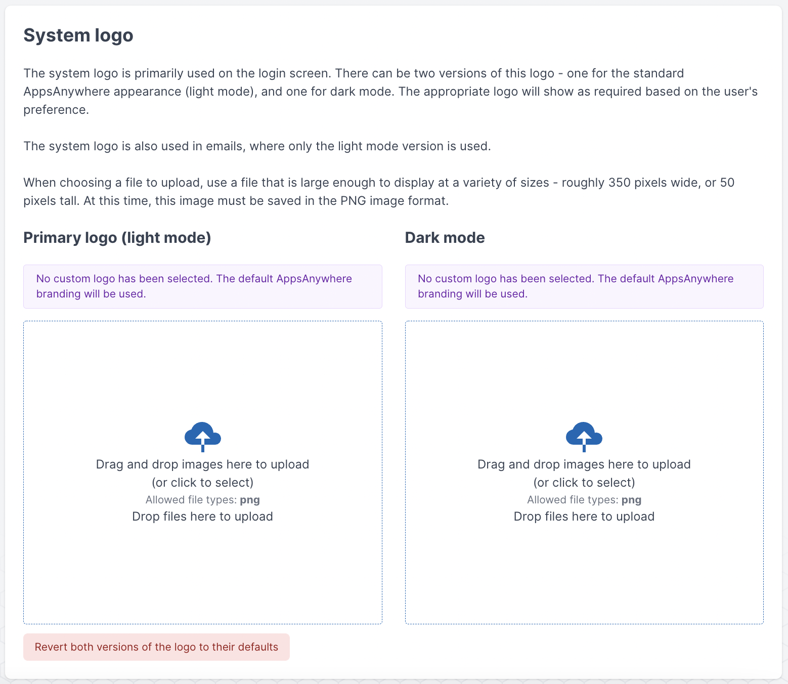Admins have ability to change logos and headers to personalise the AppsAnywhere environment, including variants specific to dark mode. If branding is not configured, then AppsAnywhere will provide default branding.