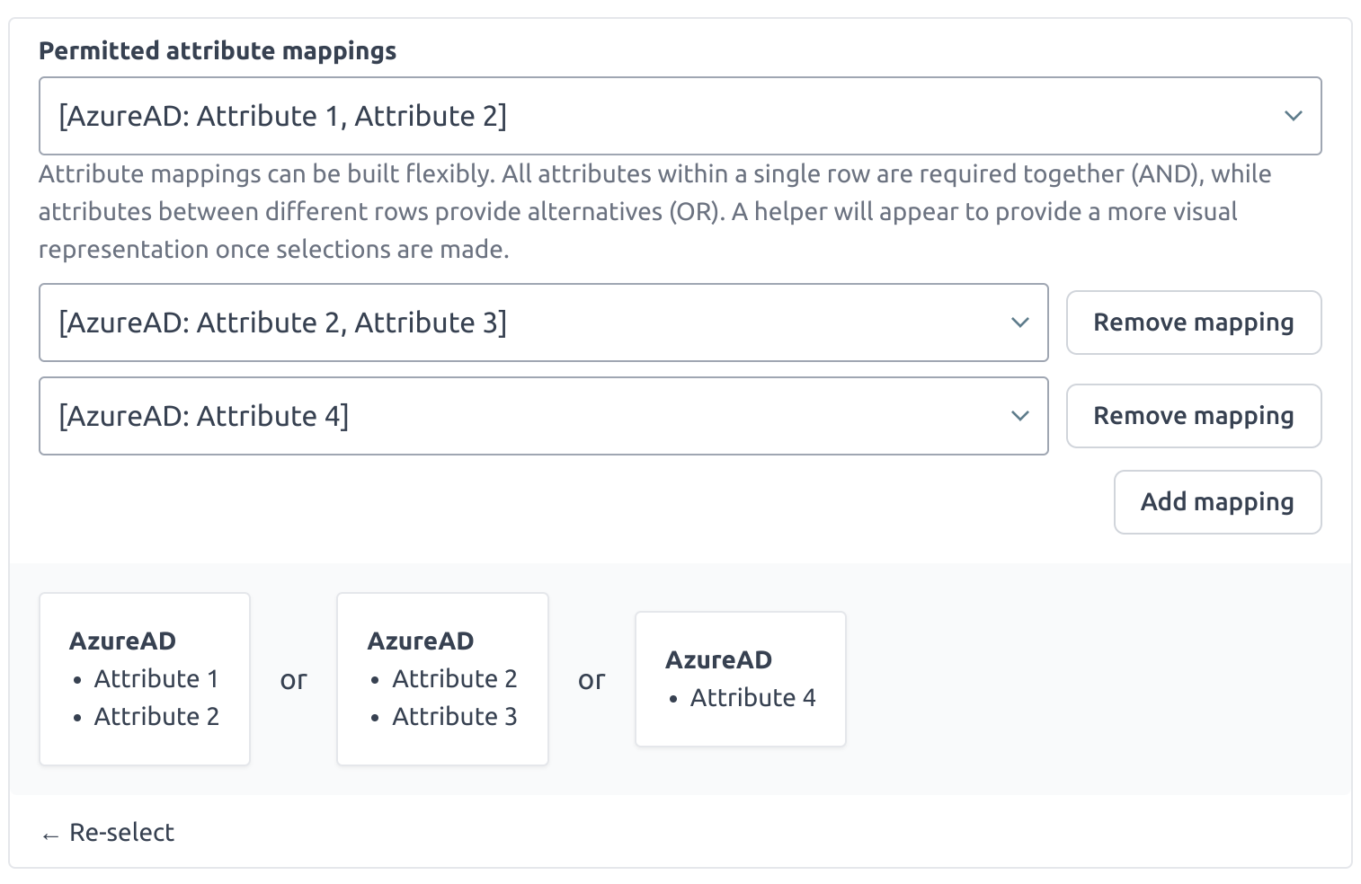 Directory mappings can simply be selected using the dropdown menu as shown, you may pick as many records as you wish to give access to based on the restrictions required. If you chose this option initially but wish to swap, you can use the Re-select button at the bottom of the restriction area.