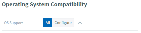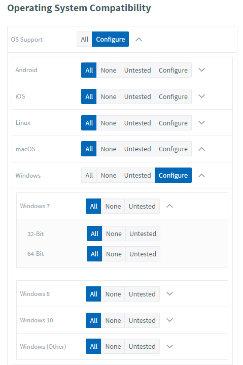 Expanded Compatibility View: ![]() | If you wish to restrict the delivery method to only work on a subset of the available operating systems, then toggle the button next to the OS Support label to Configure You will then see the main operating systems that are supported. You can change the toggle buttons for each operating system between All and None to allow or deny use on that particular operating system, or toggle any of them to Configure again to further drill down into the specific versions that you might want to specify support for. As in the example on the left for Windows 7, for many operating systems you can drill down a further level to specify whether to support the 32-bit or 64-bit version of each operating system (for those that have both), by selecting the dropdown icon next to the toggle buttons. Selecting the Untested toggle button for any operating system, version or architecture will warn the user when they launch an application on that type of device that it has not been tested in that environment, even though you expect it to work without issue. As you define each delivery method, think carefully about the types of devices you want it to run on and try and ensure you have some form of delivery method in your list to support each type of device. |