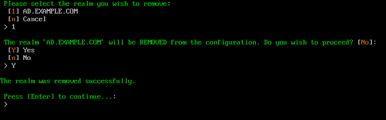 A list of currently known Kerberos realms will be displayed. Type the corresponding number to the realm you want to remove and press Enter.