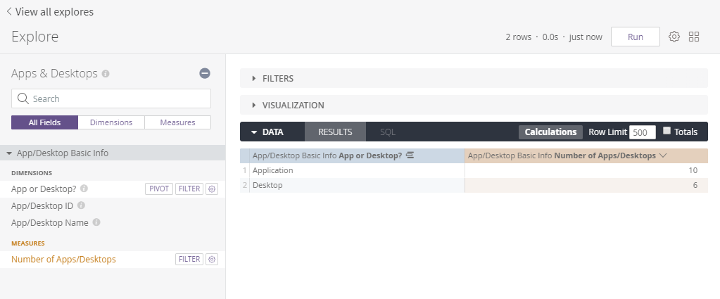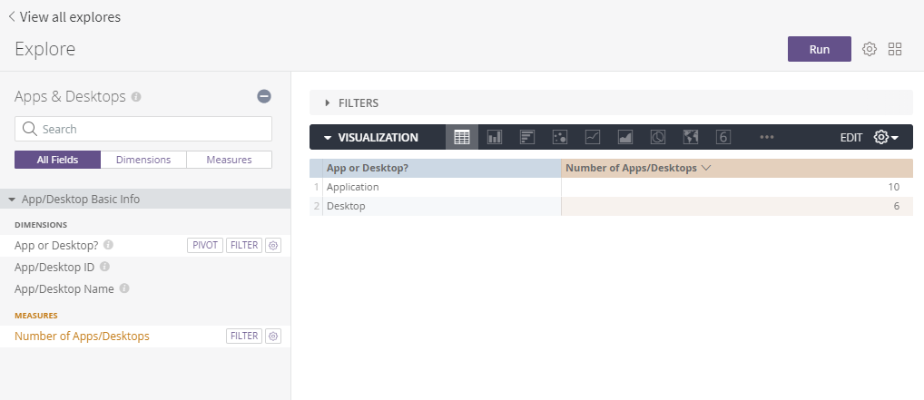 Continuing from where we left off with the number of apps and desktops, click to expand the VISUALIZATION section of the explore view.