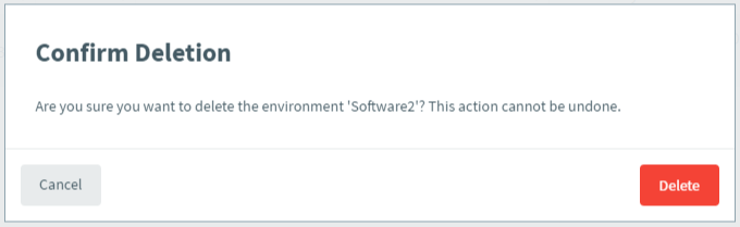 You will then be prompted to confirm the deletion. Check the name of the environment in the message to ensure you are deleting the correct one.