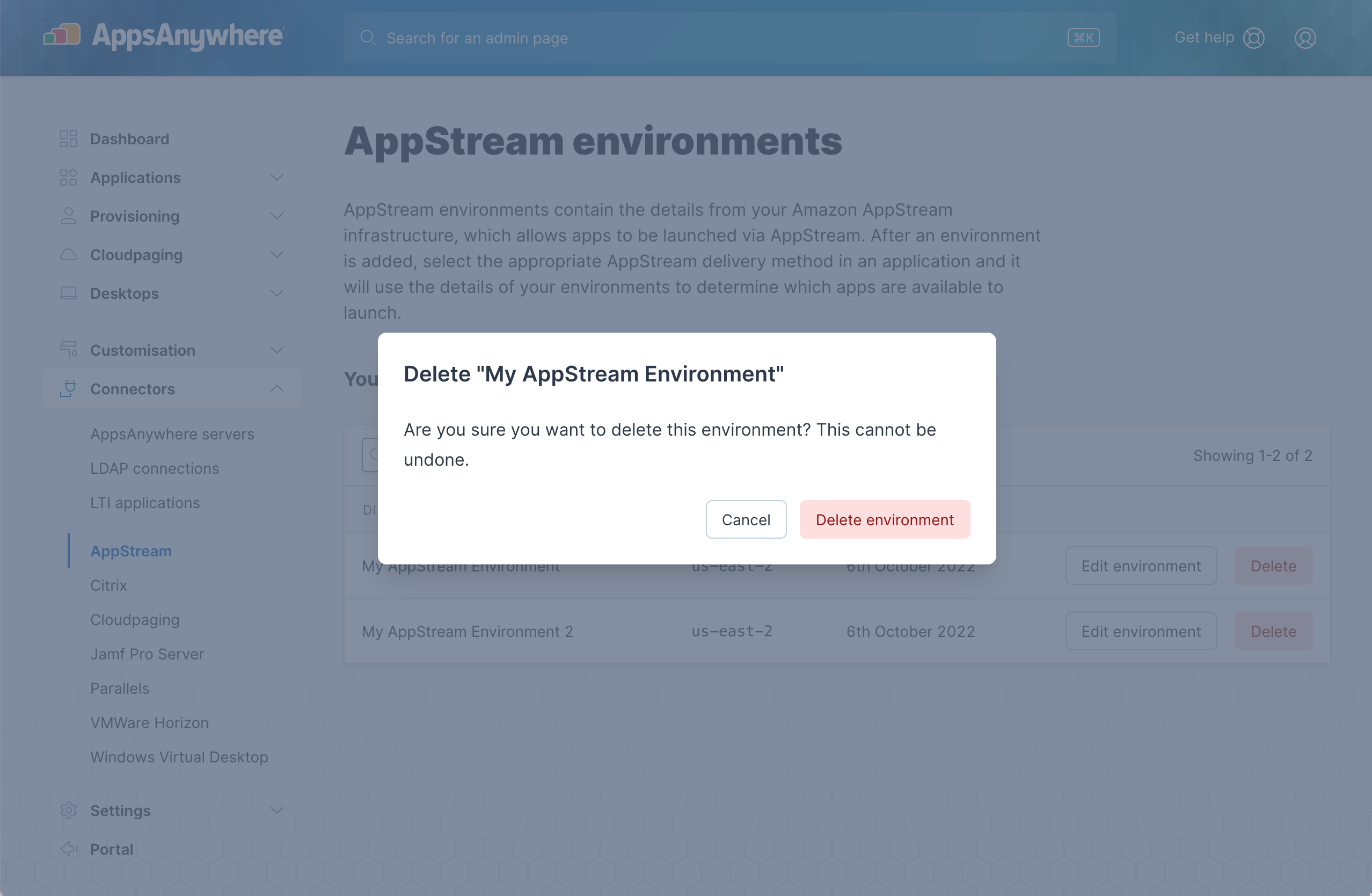 Make sure that the environment you are deleting is no longer used. Deleting an environment will immediately stop anyone from being able to launch, or re-launch, applications from that environment. Deleting an environment is not reversible