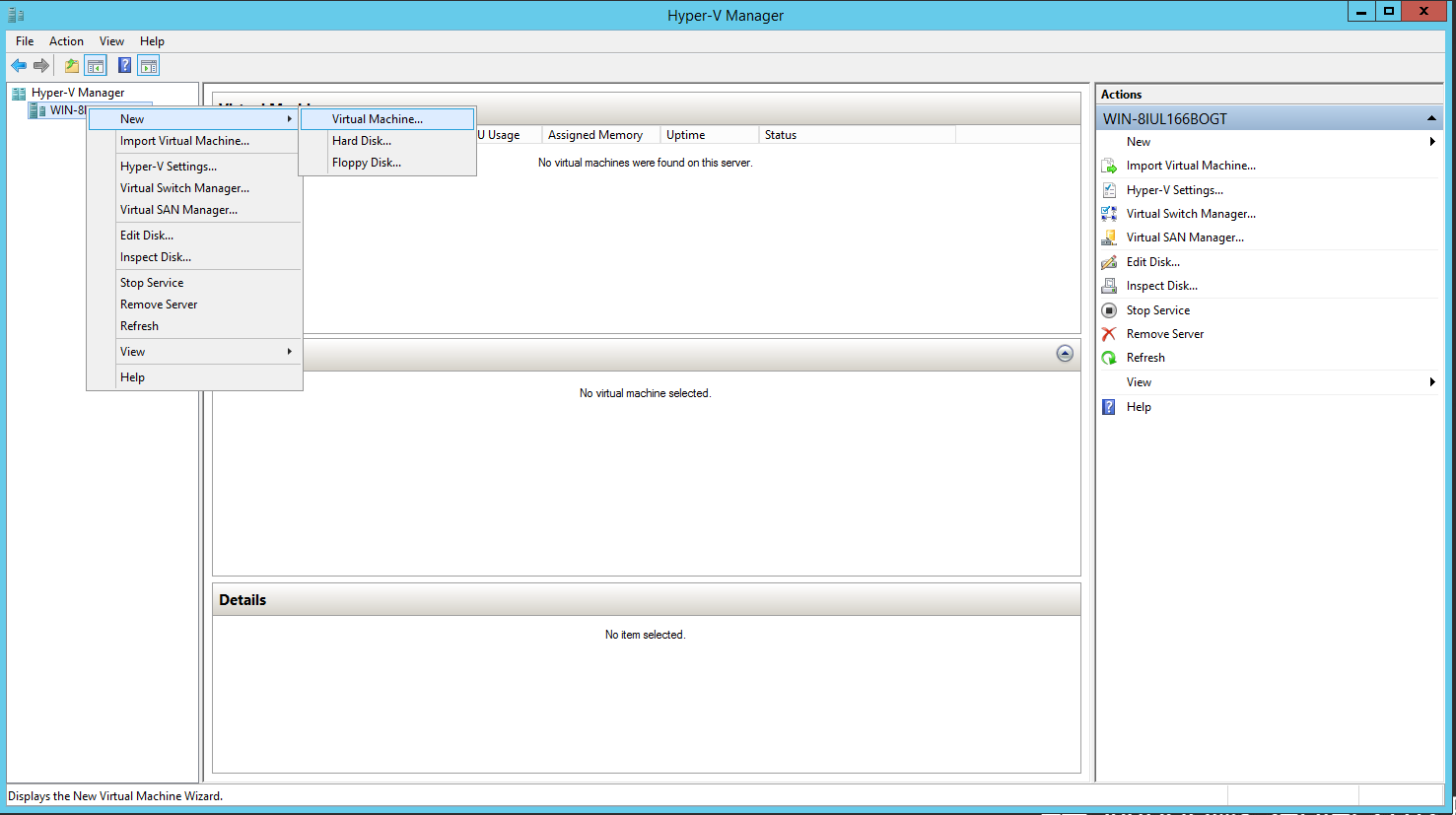 Launch the Hyper-V Manager. Select the Hyper-V host from the left-hand navigation, right click and select New > Virtual Machine