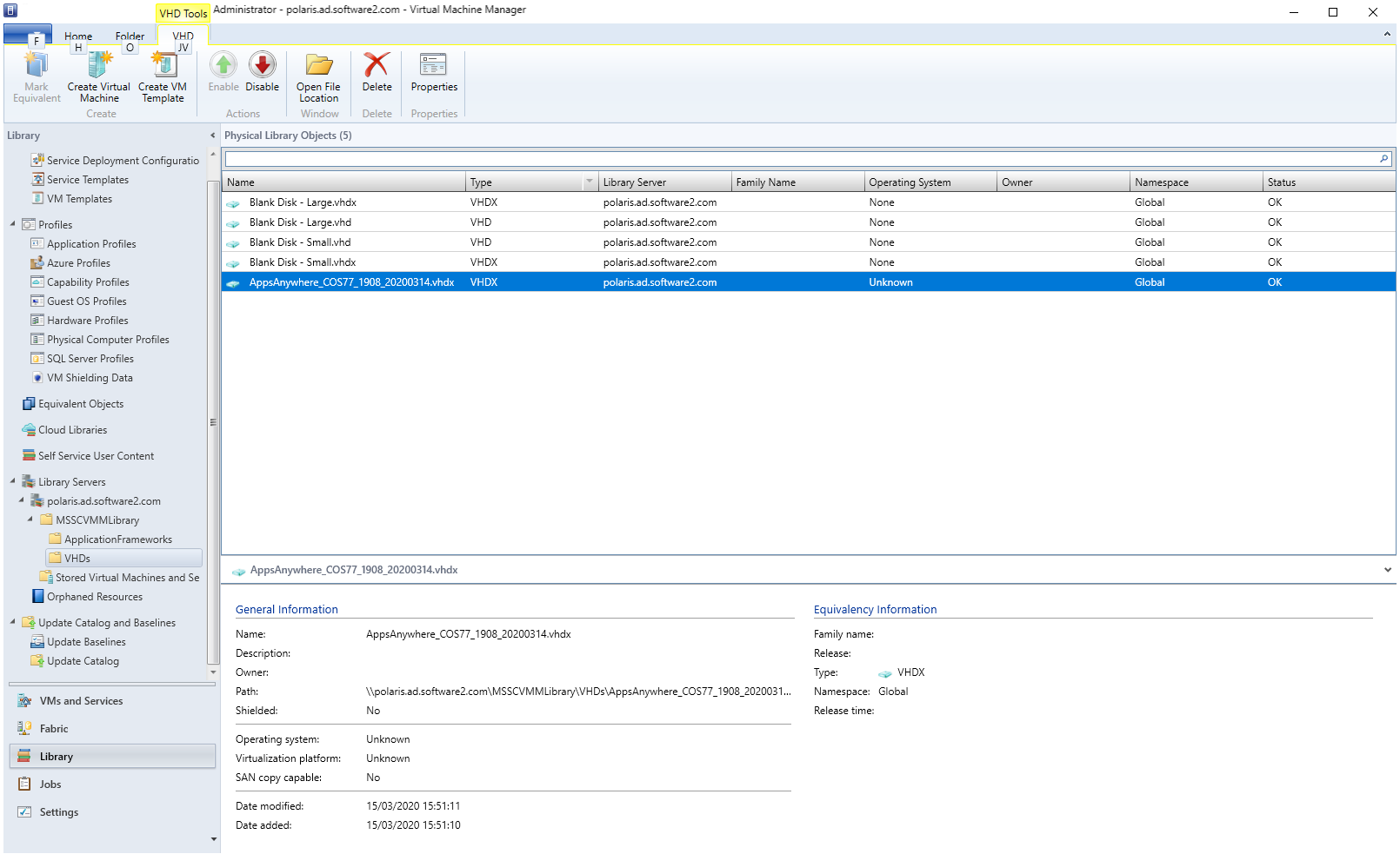 The following steps assume that the AppsAnywhere Analytics VHDK file has already been copied to the VMM Library location, as shown in the screenshot below