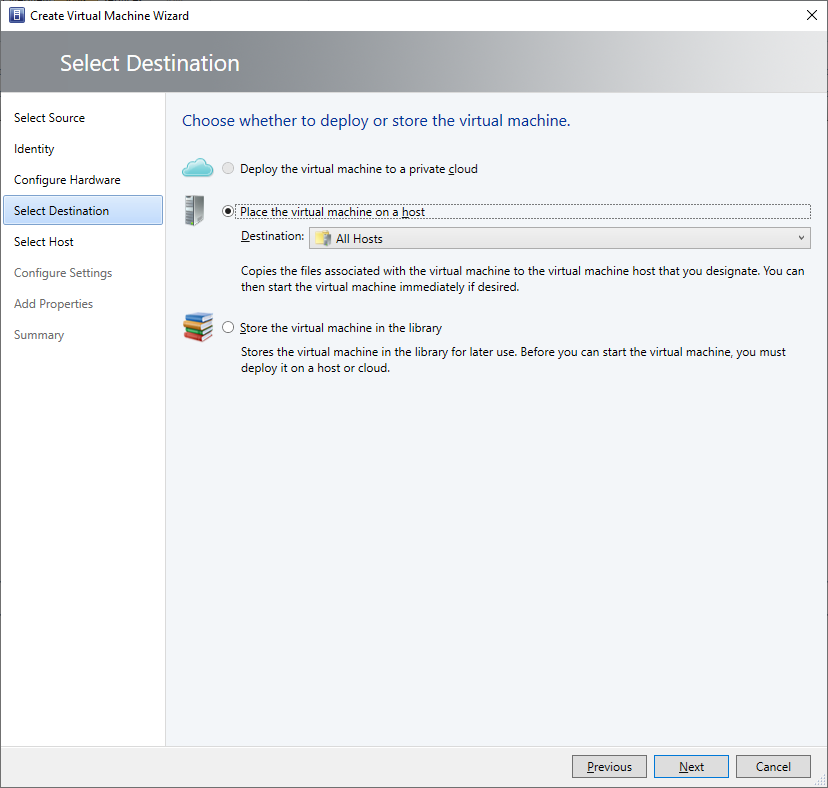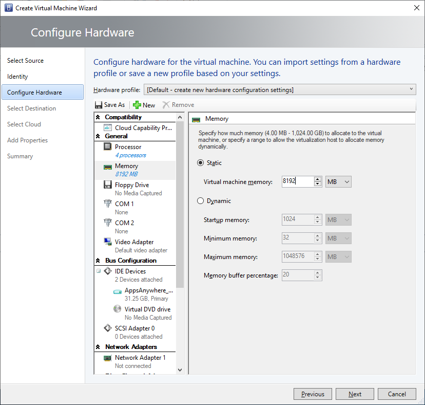 The Hyper-V AppsAnywhere appliance is provided as a single VMDK virtual disk image. To deploy the appliance, you will first need to create a virtual machine with the System Center Virtual Machine Manager.