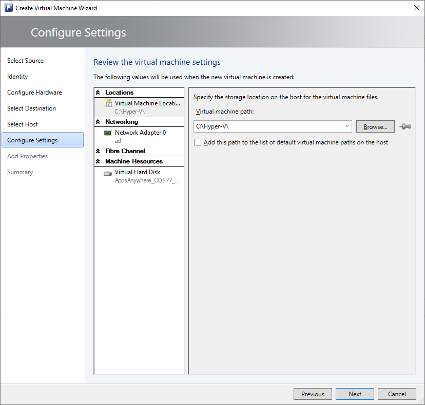 In this example, the AppsAnywhere VMDK file has been copied/moved to the required storage location (in this case “C:\Hyper-V\Virtual Hard Disks”). Depending on existing storage structure and/or policy, this location may different in your environment.