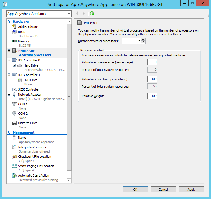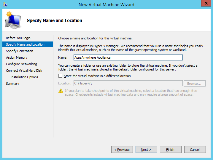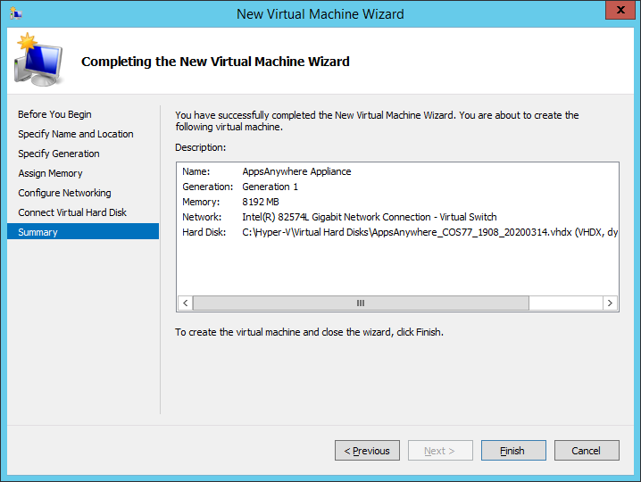 The Hyper-V AppsAnywhere appliance is provided as a single VMDK virtual disk image. To deploy the appliance, you will first need to create a virtual machine with the Hyper-V Manger.