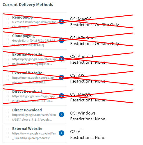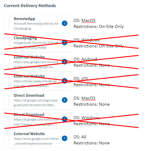 The example on the left shows a range of delivery methods, the operating systems they each support and the restrictions that are applied to each. As you can see there are a couple of delivery methods that might apply to Windows devices, similarly a couple that apply to Mac OS and general support for a couple of other devices that might want access to this app.