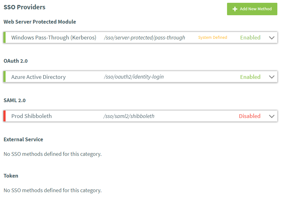Each SSO method is listed as an expandable row under it's respective SSO category, as shown above. You can see the full details for each method by clicking on the row to expand it. Clicking the row header again will collapse the details pane, as will expanding any other SSO method.