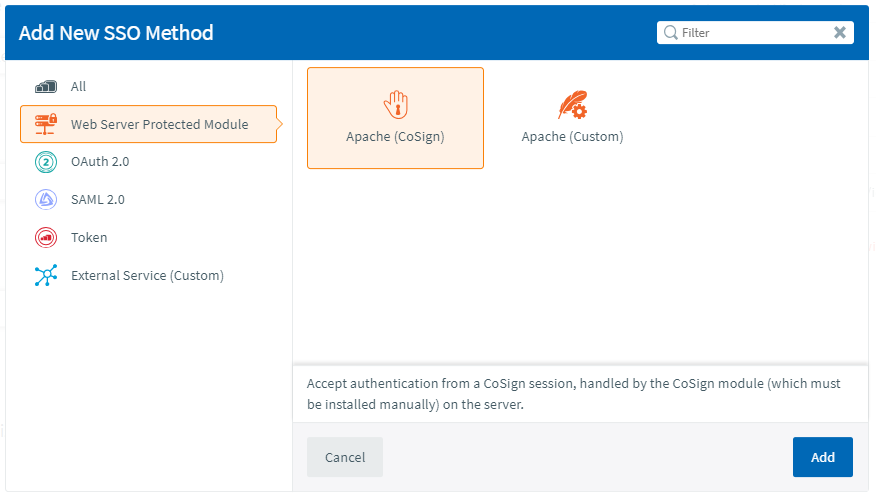 Choose the category of SSO method you want to add from the list on the left-hand side of the Add New SSO Method dialog