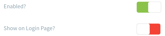 Enabled | This toggle button either enables or completely disables the method. The value is also indicated in textual form in the row summary. | SSO methods should only be enabled if they are properly configured and you are ok with user logging in with them |