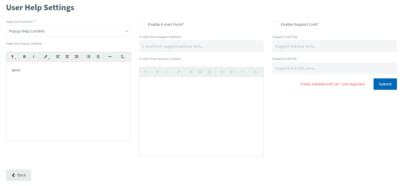 If you decide to use the pop-up dialog to provide support information instead of taking users directly to support, then select Popup Help Content from the dropdown. With this option selected, you will see a lot more options, split into three columns, as shown below.
