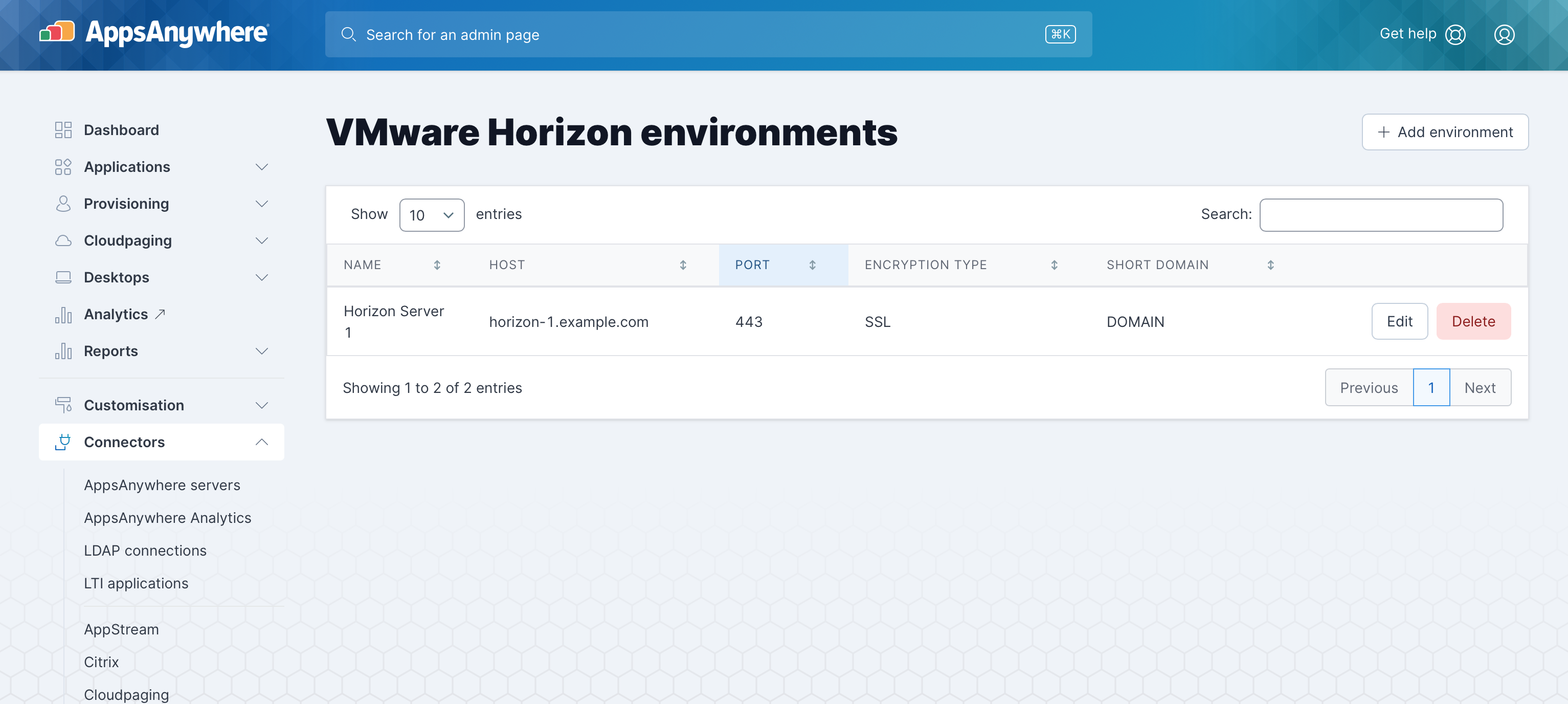 AppsAnywhere allows you to connect to multiple VMware Horizon environments at the same time, all of which you can see from the VMware Horizon environments page.