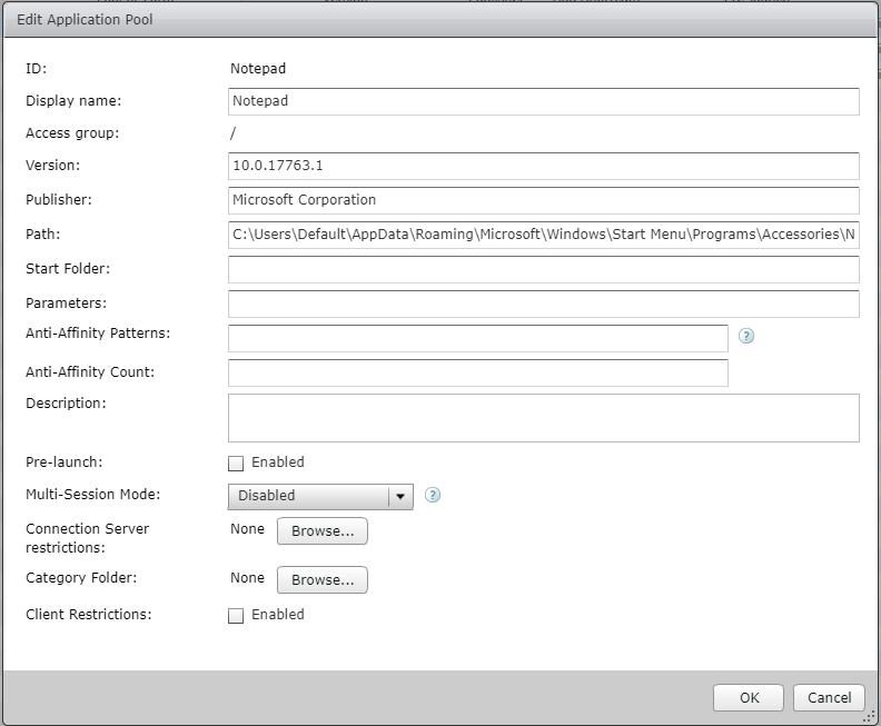 Resource name | The exact value of the "Display name" field for the published application. When applications are defined within the Horizon Admin portal, the "Display name" is specified. You must enter this value exactly as it appears in VMware Horizon. | Notepad ![]() Screenshot of the Horizon Admin showing an example published application and the “Display name” field. |
