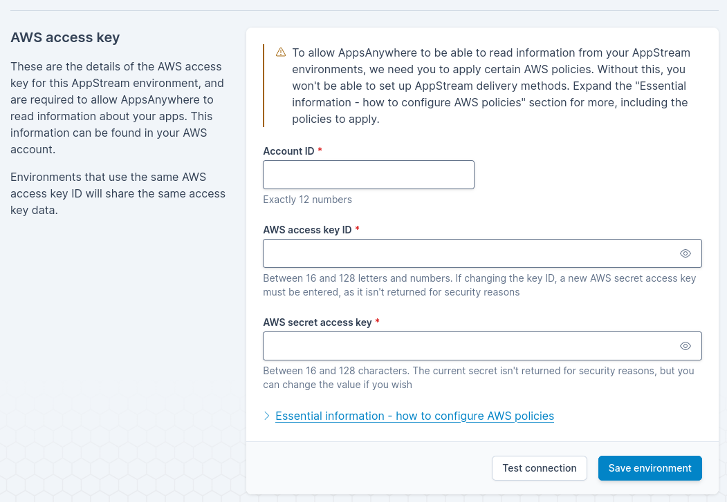 The AWS access key used for the environment will require a specific set of policies in order for AppsAnywhere to retrieve the relevant information for your AppStream Stacks, Fleets and Applications and also generate the streaming URLs. These statements are provided on the Environment create and edit screens by expanding the Essential information - how to configure AWS policies section at the bottom of each page. There are also static policy references below this paragraph.