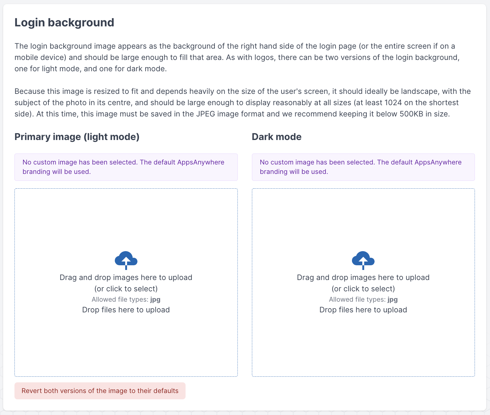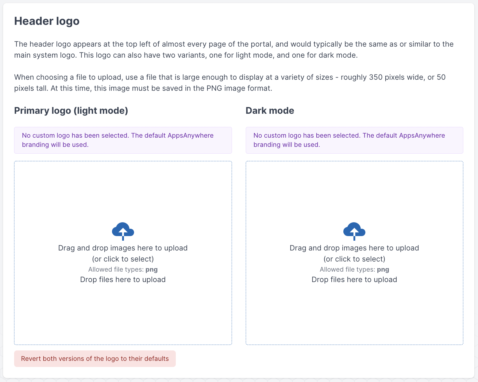 Admins have ability to change logos and headers to personalise the AppsAnywhere environment, including variants specific to dark mode. If branding is not configured, then AppsAnywhere will provide default branding.