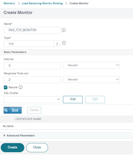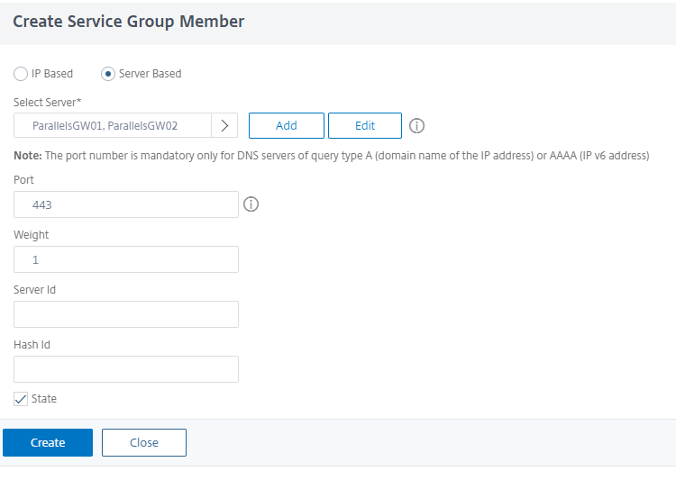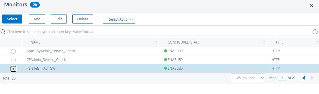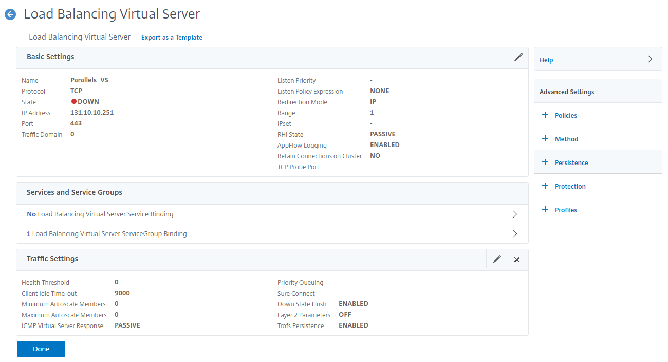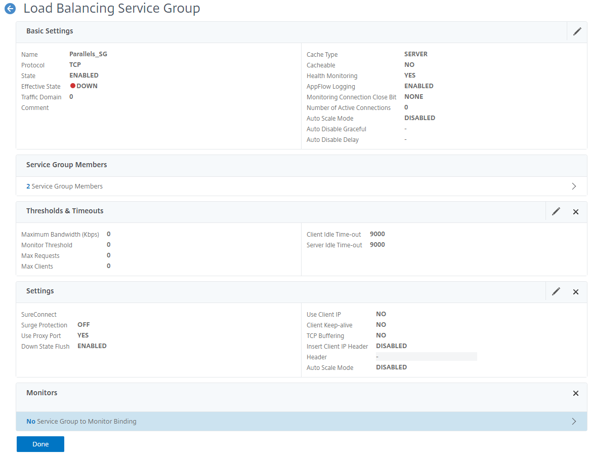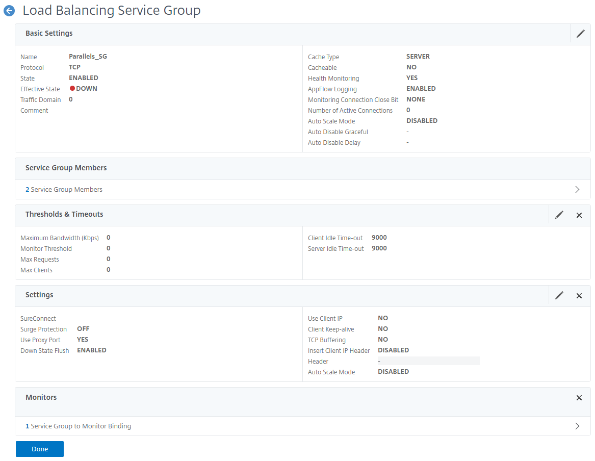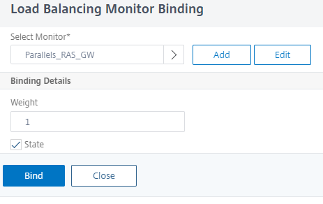 The following Server, Monitor, Service Group and Virtual Server configurations can be used with the Parallels RAS Gateway servers.