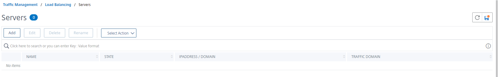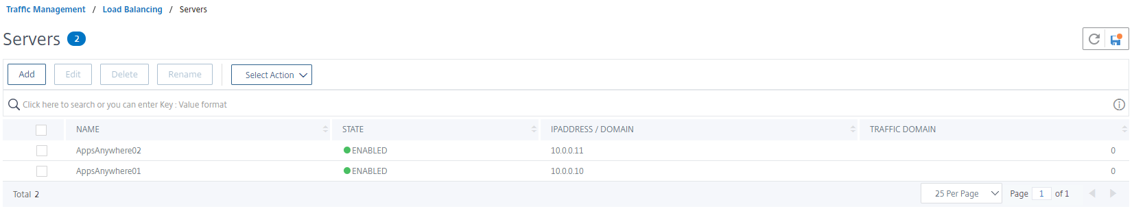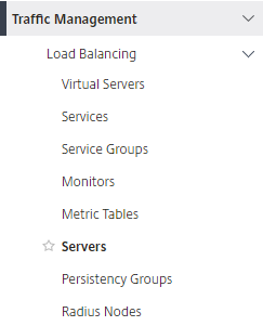 To add the AppsAnywhere server details so they can be used with a virtual server and service group, login to the Citrix Netscaler / ADC interface and select Servers from the Traffic Management -> Load Balancing section: