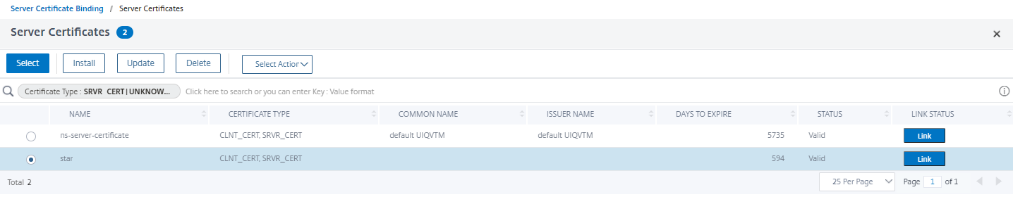Click the “>” icon next to the Select Server Certificate option, select your existing Server Certificate and click Select to continue :
