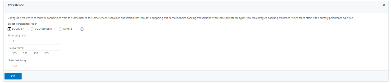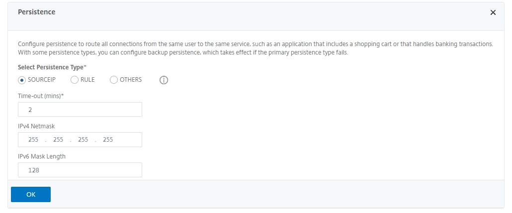 Select SOURCEIP under the Select Persistence Type section, click OK to continue: