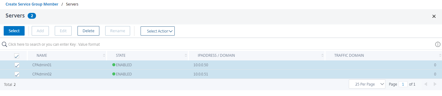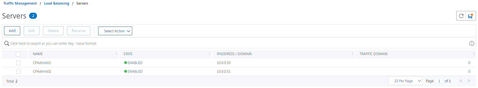 To add the Cloudpaging Admin/License server details so they can be used with a virtual server and service group, login to the Citrix Netscaler / ADC interface and select Servers from the Traffic Management -> Load Balancing section: