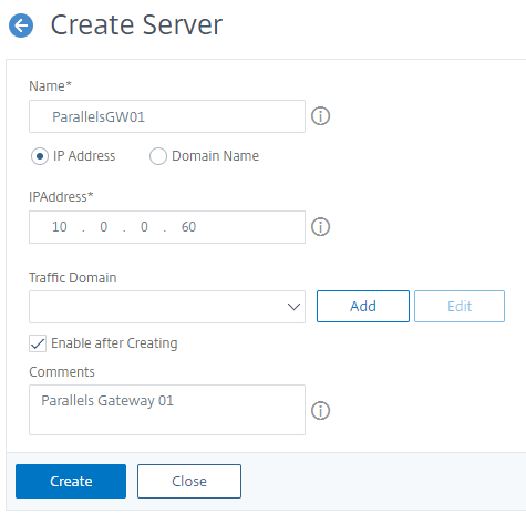 Specify the required name and IP address of your Parallels RAS Gateway server and click Create to add the entry: