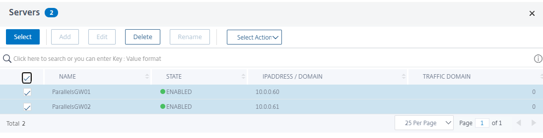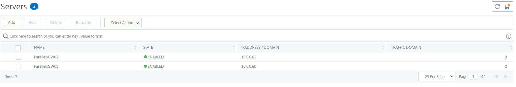 To add the Parallels RAS Gateway server details so they can be used with a virtual server and service group, login to the Citrix Netscaler / ADC interface and select Servers from the Traffic Management -> Load Balancing section: