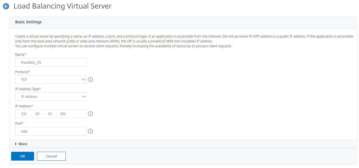Specify the Name or the Virtual Server, select TCP from the protocol list, specify the IP Address the Virtual Server will listen on and enter 443 as the port number. Click OK to continue.
