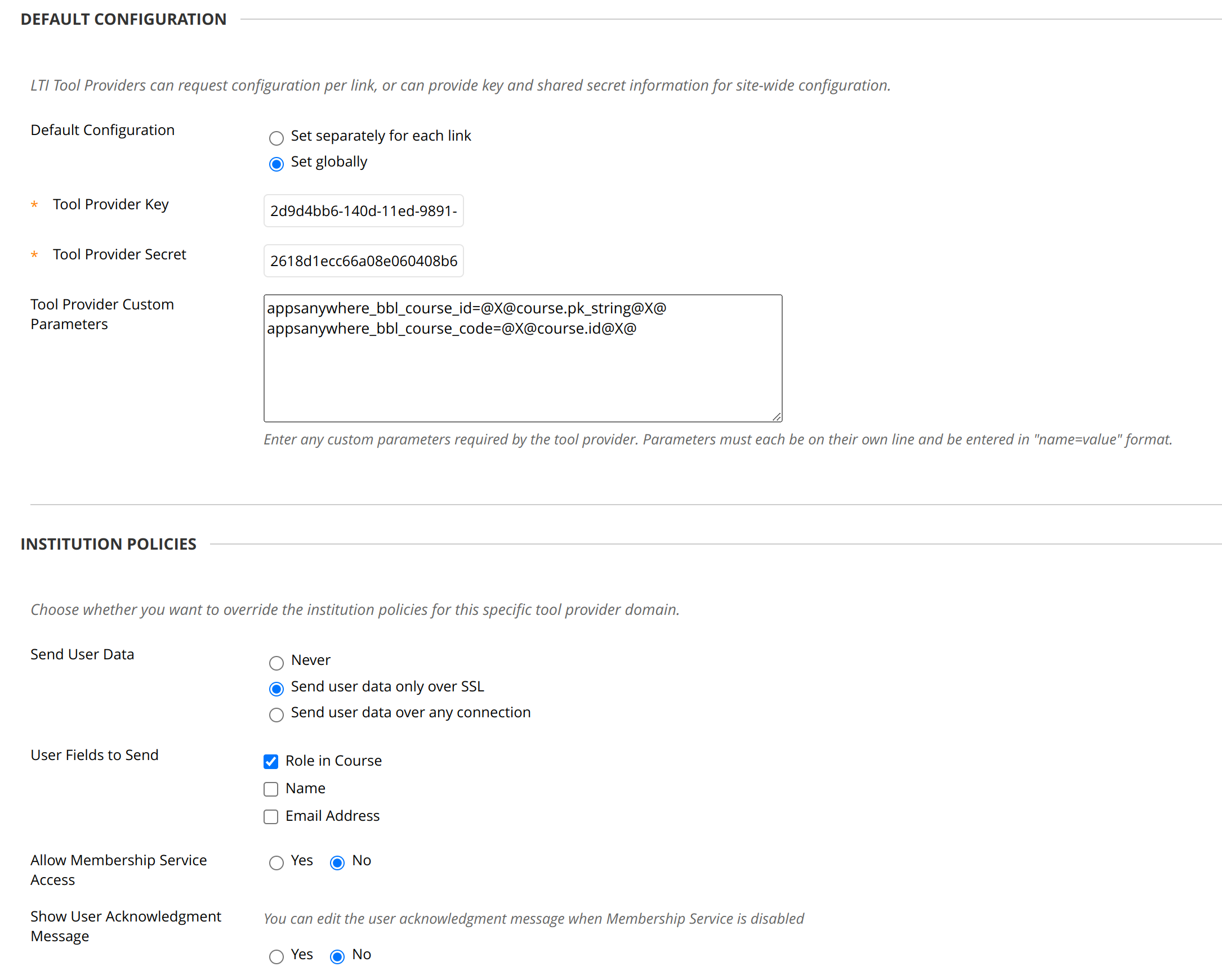If you chose not to apply configuration globally above, you will also have to copy the Tool Provider Key (Consumer key), Tool Provider Secret (Consumer secret) and Tool Provider Custom Parameters (Config) into this placement