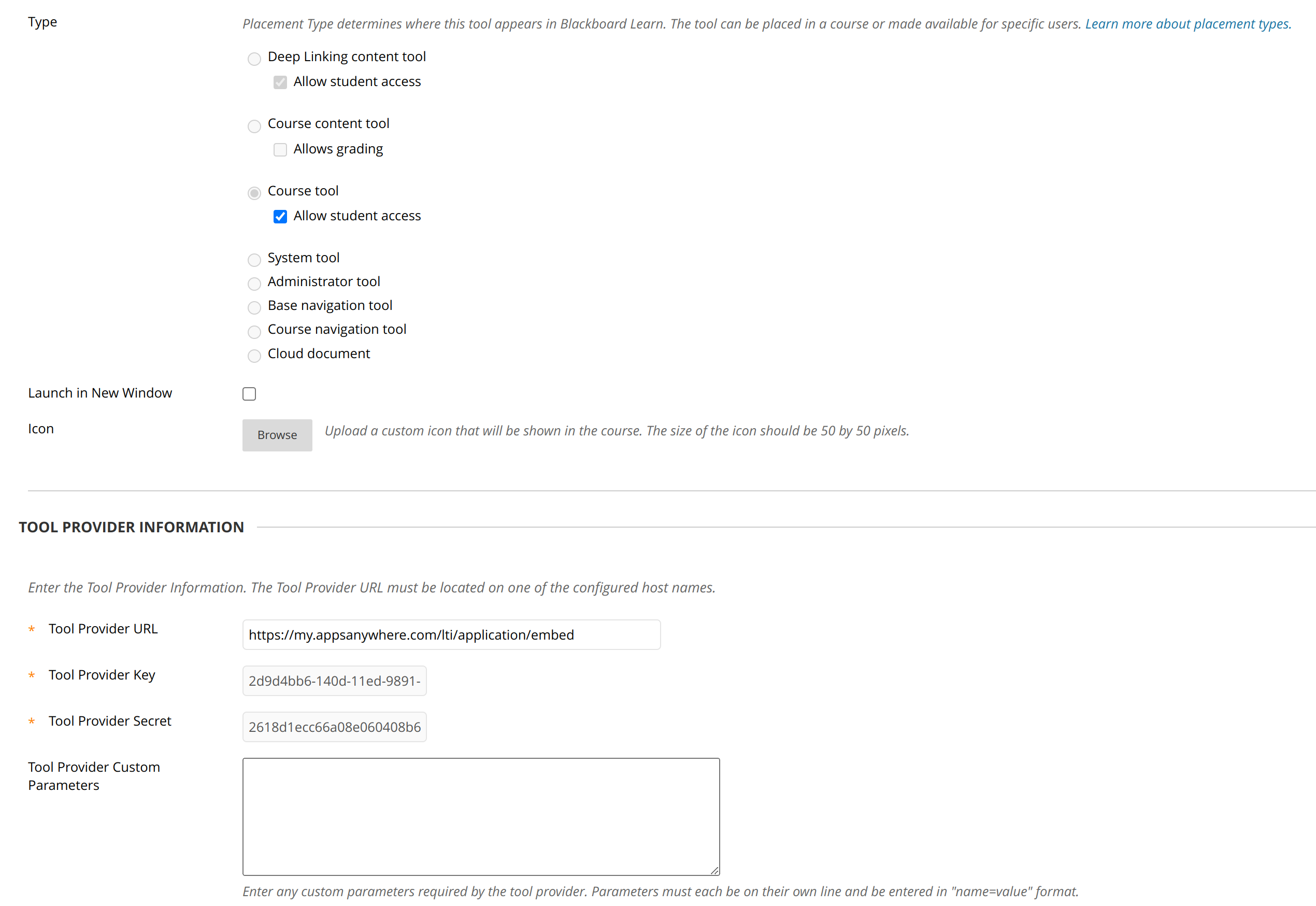 4. The Tool Provider Key (Consumer key), Tool Provider Secret (Consumer secret) and Tool Provider Custom Parameters (Config) should be copied and pasted from Embeds in AppsAnywhere