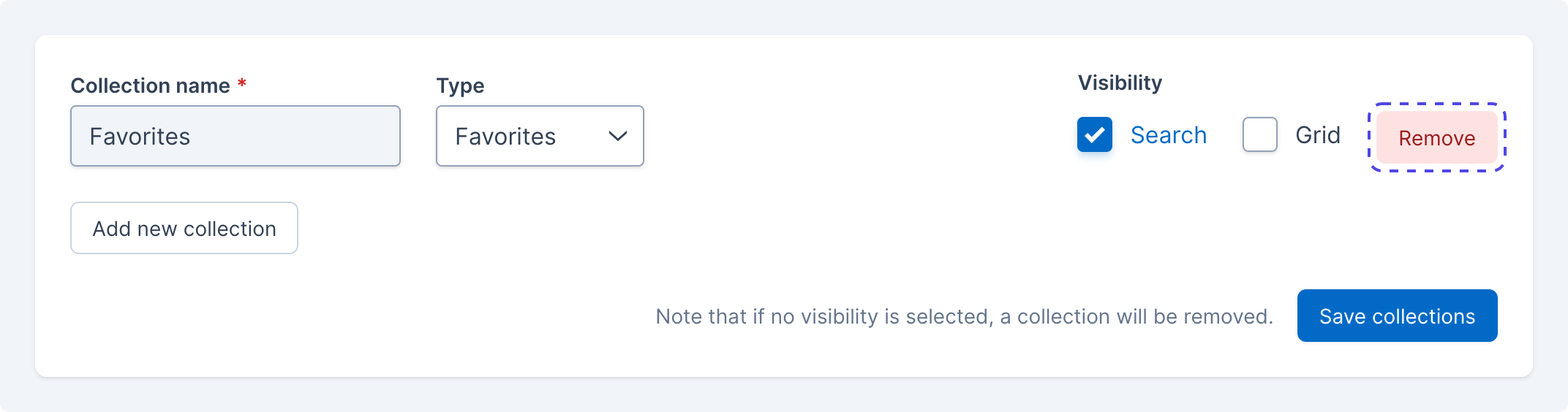 An example of the removal of the Favorites collection, with the Remove button highlighted