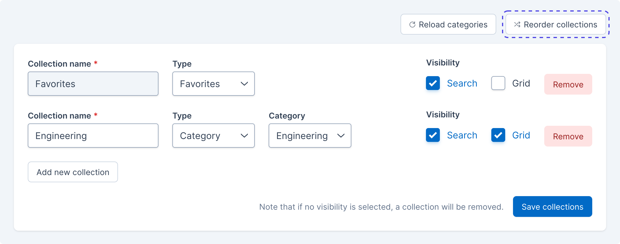 Click the Save search collections or Save app grid collections button, depending on which section you are editing