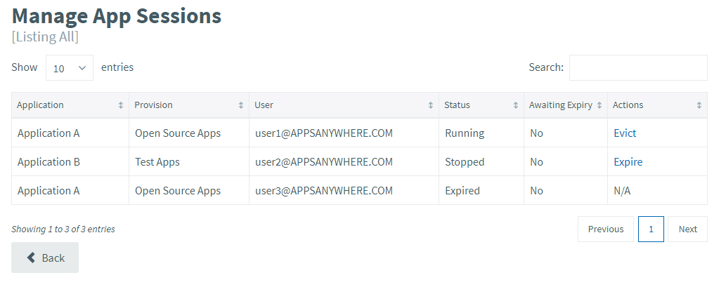 To evict or expire an app session, simply locate the app session as described above and click either Evict or Expire in the Actions column for that row in the table. You will be asked to confirm this action and then you should see the updated status for that record in the table immediately.