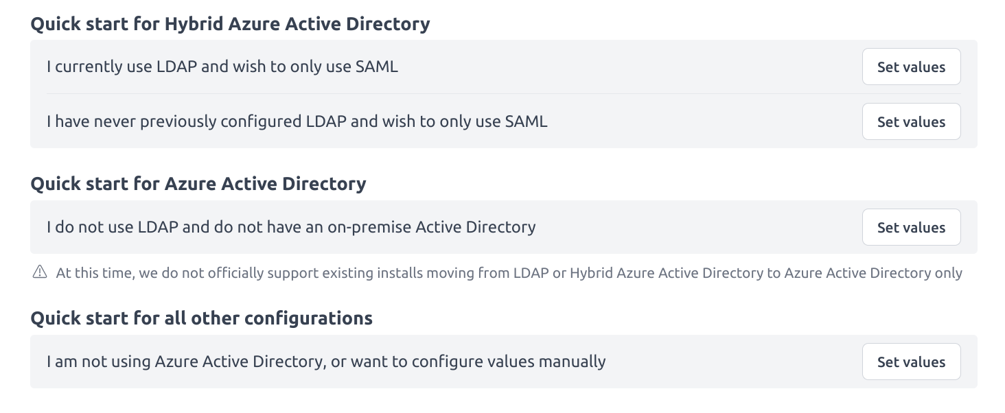 If the incorrect quick start option had been previously used, it is recommended to manually remove the populated values in the User Unique ID Attribute, User Principal Name Attribute and User Display Name Attribute fields before selecting a new quick start option.